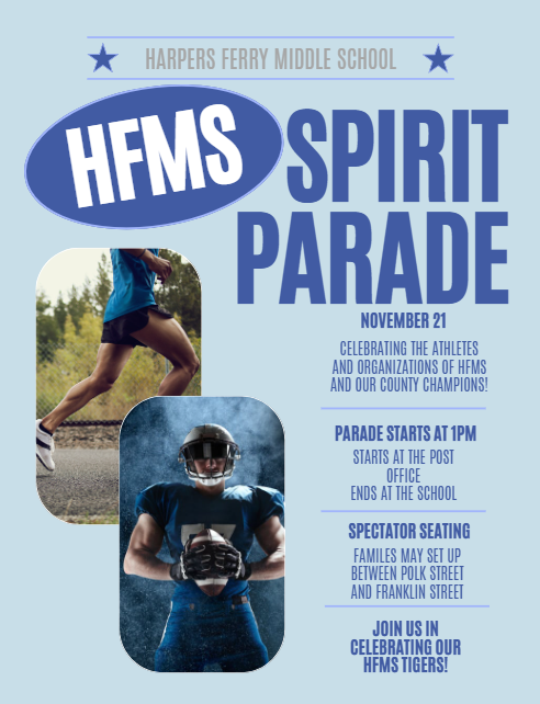 HFMS will be hosting a Spirit Parade on November 21, 2025 @ 1:00 pm. Join us as we celebrate the HFMS athletes and organizations of HFMS and our County Football Champions! Go Tigers!
