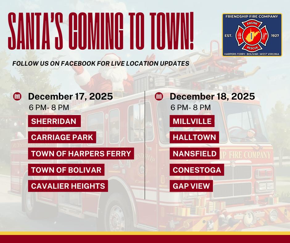 Posted on December 3, 2025, Edited December 3, 2025 by Laura Whittington Santa Claus is Coming to Town!! Santa Claus is Coming to Town! See Schedule below for dates & times in your area.